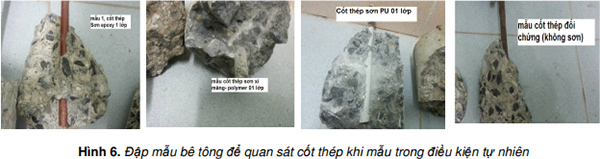 Sau 17 tháng đặt mẫu trong điều kiện tự nhiên, tác giả đã đập bỏ phần bê tông bảo vệ của các mẫu có sơn 01 lớp lên cốt thép và quan sát lớp sơn bảo vệ cốt thép. Lớp sơn bảo vệ không bị lão hóa hay bong tróc. Cốt thép được phủ sơn bảo vệ chưa bị ăn mòn, tuy nhiên cốt thép của mẫu đối chứng đã bị ăn mòn, xuất hiện gỉ lấm tấm.