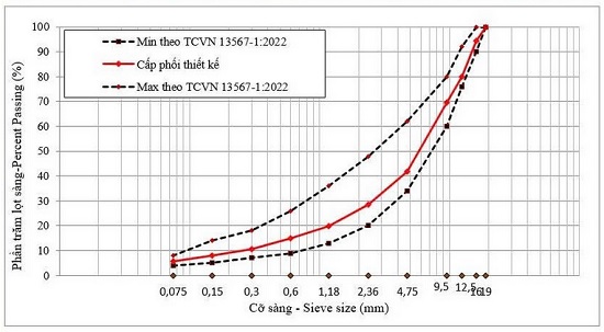 Thiết kế hỗn hợp theo TCVN 13567-1:2022 [11]. Kết quả loại BTN C16 hàm nhựa tối ưu 4,5% theo khối lượng hỗn hợp, độ rỗng cốt liệu VMA=14,39%, độ rỗng lấp đầy nhựa VFA=68,19%. Đường cong cấp phối thiết kế BTN như Hình 2.