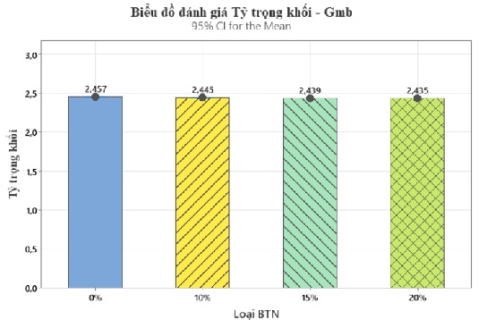Hình 6a thể hiện kết quả đánh giá tỷ trọng khối (Gmb) cho thấy sự giảm dần khi tăng hàm lượng bột cao su trong hỗn hợp BTN. Mẫu đối chứng 0% có Gmb cao nhất đạt 2,457; khi bổ sung 10% và 15% bột cao su, tỷ trọng khối giảm nhẹ xuống còn 2,445 và 2,439. Ở hàm lượng 20%, Gmb đạt giá trị thấp nhất là 2,435.
