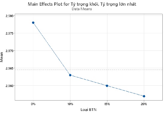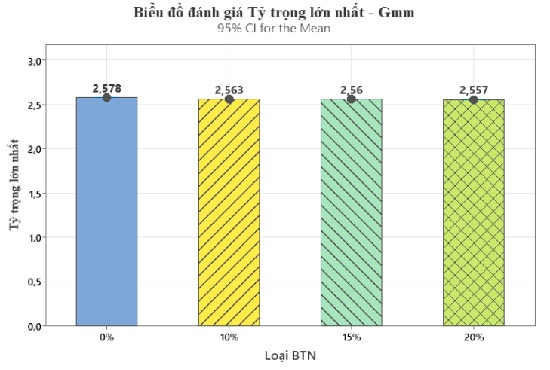 Xu hướng giảm này phản ánh đặc tính khối lượng riêng thấp và tính đàn hồi của bột cao su, khiến hỗn hợp có mật độ thấp hơn khi hàm lượng phụ gia tăng. Tuy vậy, mức biến thiên Gmb chỉ dao động trong khoảng hẹp (0,022), cho thấy bột cao su không gây ảnh hưởng đáng kể đến cấu trúc đặc chắc của hỗn hợp.