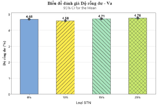 Hình 3c thể hiện kết quả độ rỗng dư (Va) cho thấy hỗn hợp BTN dao động trong khoảng 4,58 - 4,76%, nằm trong giới hạn chấp nhận được theo yêu cầu kỹ thuật với TCVN 13567-1:2022 [11]. So với mẫu đối chứng (4,68%), việc bổ sung bột cao su ở mức 10% giúp giảm nhẹ độ rỗng dư xuống 4,58%, phản ánh sự sắp xếp chặt hơn của cốt liệu.