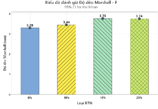 Đáng chú ý, độ dẻo gần như không thay đổi giữa các mức 15% và 20%, cho thấy hỗn hợp đã đạt ngưỡng ổn định về đặc tính biến dạng khi hàm lượng phụ gia cao. Điều này gợi ý rằng việc gia tăng phụ gia vượt quá 15% không mang lại cải thiện đáng kể về độ dẻo.