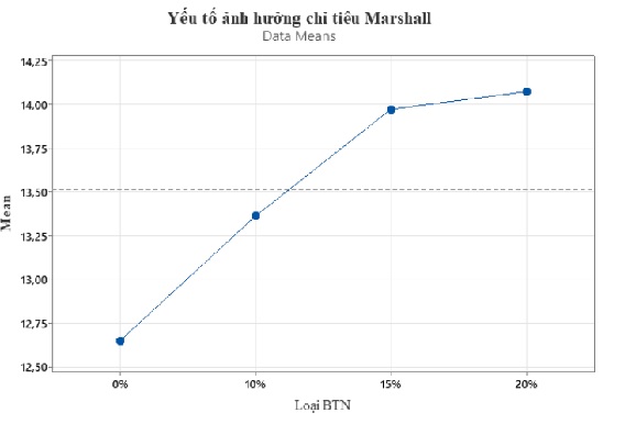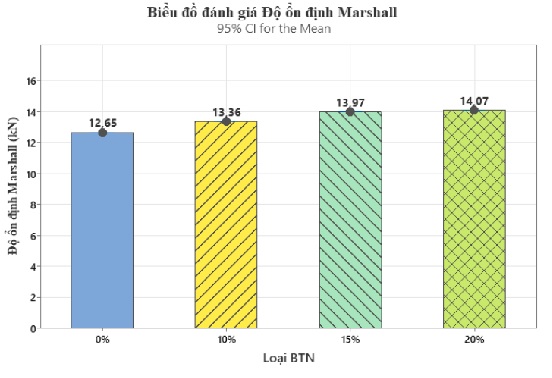 Kết quả thí nghiệm độ ổn định (Hình 4) cho thấy việc bổ sung phụ gia bột cao su giúp cải thiện đáng kể độ ổn định Marshall của hỗn hợp BTN. So với mẫu đối chứng (12,65 kN), các mẫu có phụ gia ở mức 10%, 15% và 20% lần lượt tăng 5,6%, 10,4% và 11,2%, cho thấy xu hướng cải thiện rõ rệt khi có mặt bột cao su.