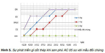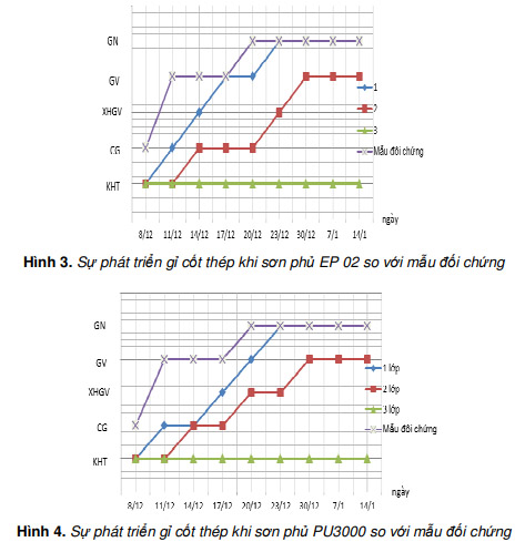 Nhận xét: Sau hơn 1 tháng thử nghiệm ăn mòn cốt thép bằng phương pháp gia tốc cho thấy: 3 loại sơn có chiều dày 3 lớp đều có khả năng chống ăn mòn cho cốt thép. Ba loại sơn có 3 lớp không có hiện tượng ăn mòn cốt thép tại thời điểm kết thúc đo. Mẫu đối chứng xuất hiện gỉ từ ngày thứ 3, còn các mẫu sơn 1 lớp xuất hiện từ ngày thứ 6, ngày thứ 9.