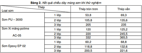 Để nghiên cứu cường độ liên kết giữa cốt thép khi được sơn phủ và bê tông, nghiên cứu gia tốc ăn mòn cốt thép tác giả đã lựa chọn 03 loại sơn: Sơn Epoxy EP 02, Sơn Xi măng-polime AC-05, Sơn PU – 3000 sơn lên cốt thép khi thử nghiệm với 3 lớp có chiều dày khác nhau như trong bảng 2, phương pháp đo theo tiêu chuẩn TCVN 9406 : 2012 [6].
