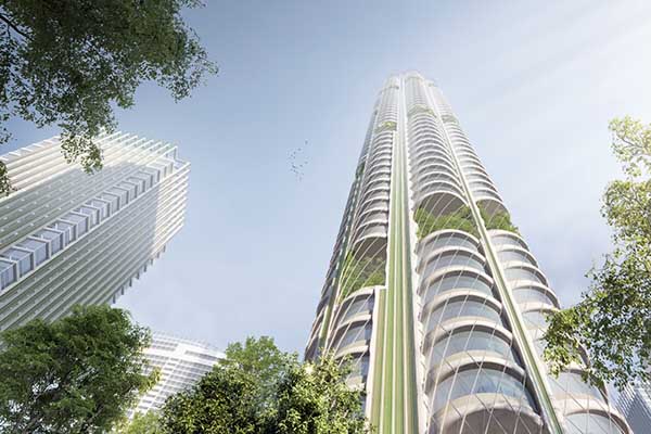 Được đặt tên theo loài cây cao nhất Thế giới, thiết kế mới là sản phẩm của Công ty kiến trúc Skidmore, Owings & Merrill ở Chicago, dựa trên những công nghệ sẵn có hiện nay. Mỗi tòa nhà chọc trời sẽ ứng dụng nhiều kỹ thuật để thu thập carbon, bao gồm xây dựng bằng vật liệu hấp thụ carbon, trồng cây xanh và tảo (để lấy nhiên liệu, năng lượng và thực phẩm) cùng công nghệ hút khí trực tiếp. "Hiệu ứng xếp chồng" từ thiết kế giúp hút khí vào trung tâm tòa nhà để lọc carbon.
